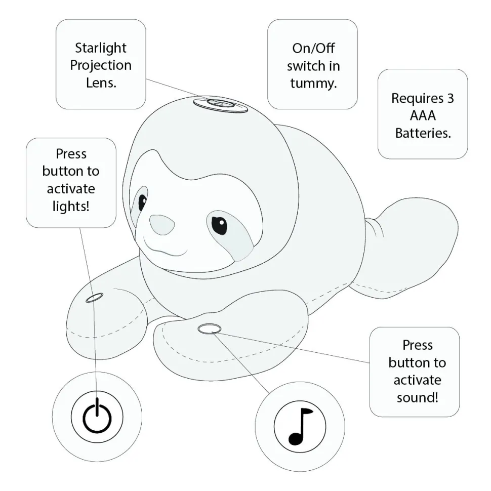 You Can Bring The Wonders Of The Night Sky Inside When You Hang Around With Our Stanley, Our Starlight Musical Sloth Stuffed Animal! Simply Press The Button On His Front Paw To Project A Crescent Shaped Moon Accompanied By A Generous Scattering Of Whimsical Stars. Gentle, Soothing Versions Of Baby’S Favorite Melodies Can Be Played Along With The Star Show For An Immersive Fantasy Experience. Control Options For These Features Include Repeat, Independent On/Off Light & Sound, And Auto Shut-Off After 5 Minutes. A Friendly Face And The Cuddliest Plush Materials Make This Lovable Sloth Soft Toy A Favored Friend, While Embroidered Baby-Safe Details Make Him Beloved By Parents. More Fun Can Be Had With This Appealing Character With Additional Accessories From Our Stanley The Sloth Collection. Pick And Choose Your Favorites To Build A Coordinated Set To Give As A Gift Or Keep For Your Baby.